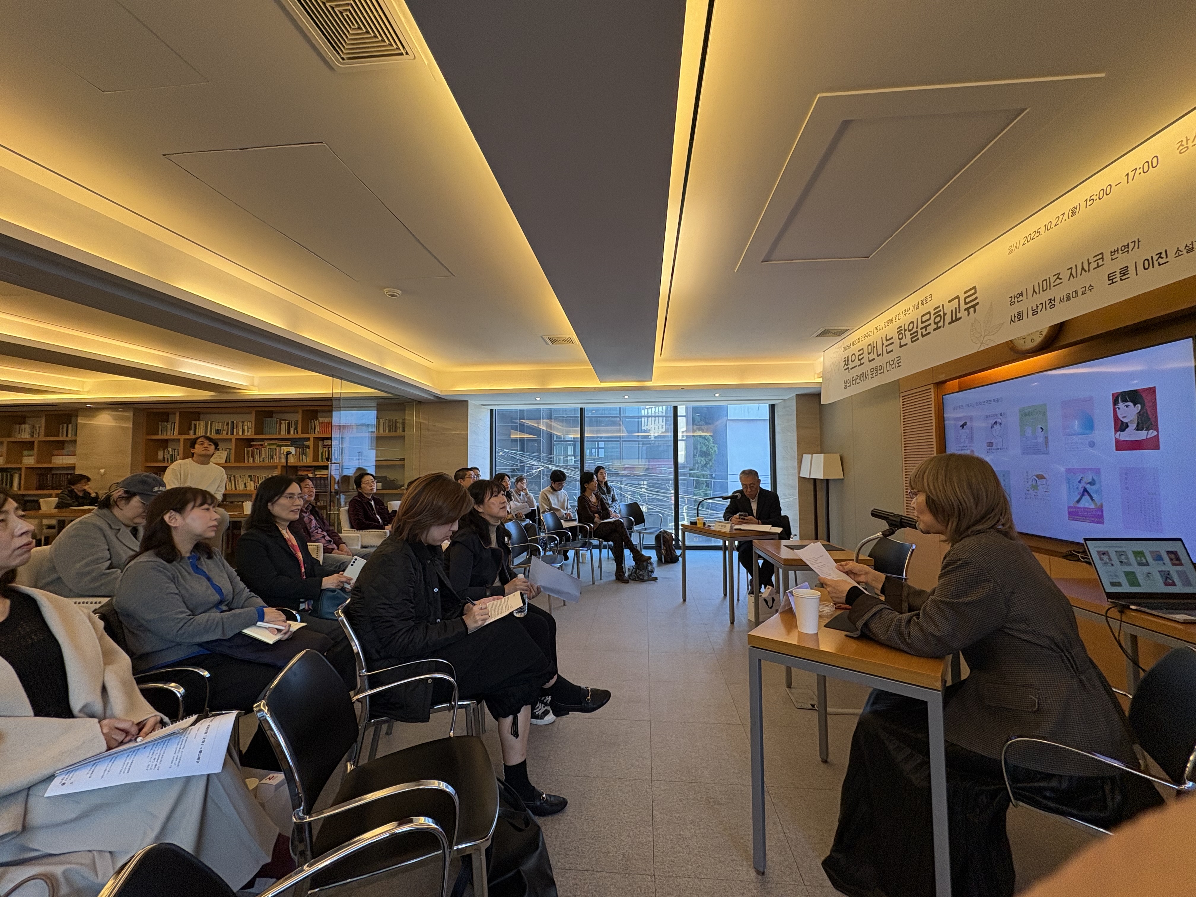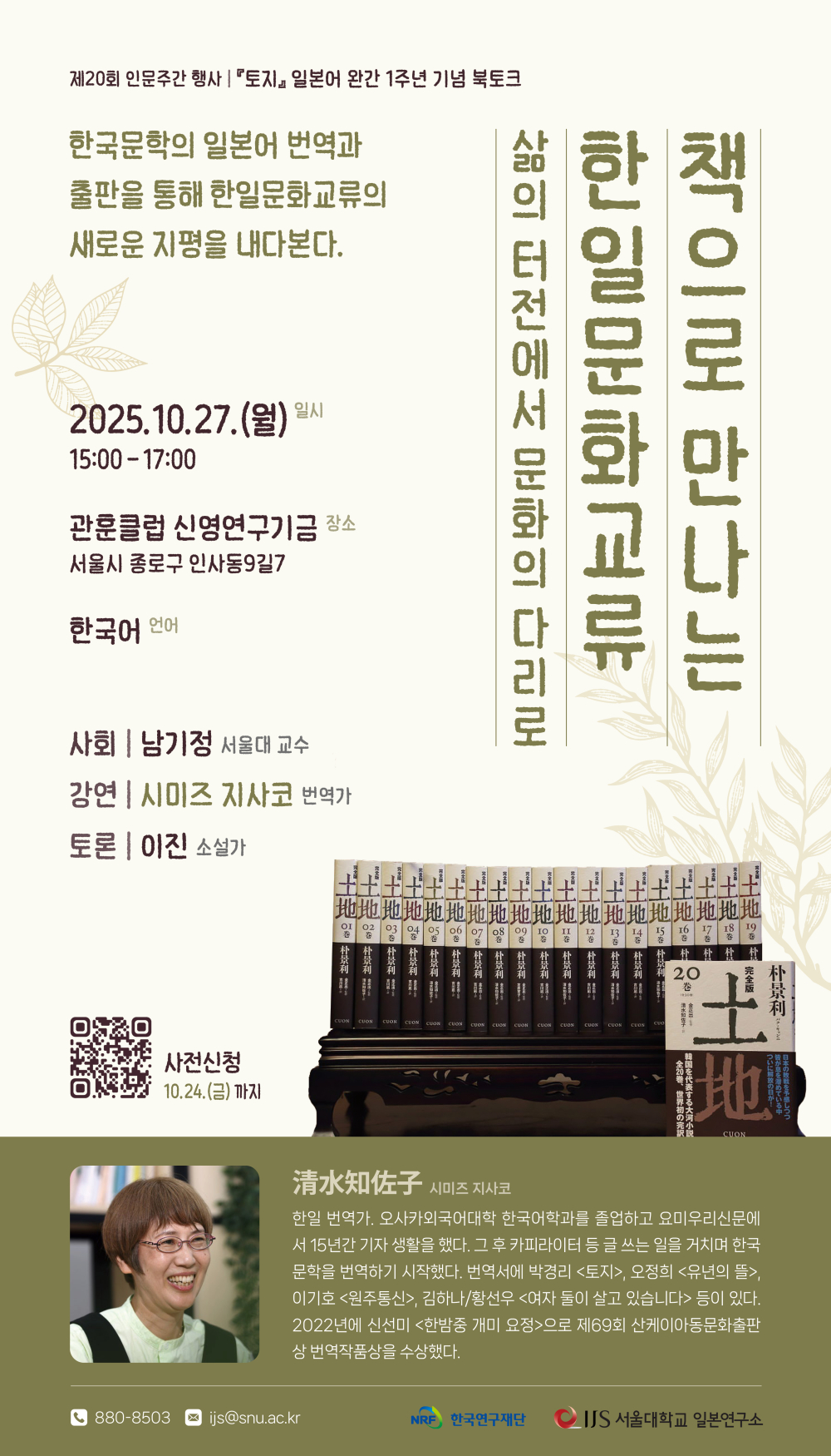 제20회 한국연구재단 인문주간행사의 일환으로 박경리 작가의 『토지』의 일본어 번역본이 완간된 지 1주년을 기념한 북토크 <책으로 만나는 한일문화교류>가 개최되었다. 서울 인사동의 관훈클럽 신영연구기금에서 개최된 행사는 약 30여 명의 사전신청자가 참석한 가운데 성황리에 진행되었다. 공동 번역가 중 한 명인 시미즈 지사코 번역가가 <토지>를 번역하게 된 계기와 번역 도중에 생겨난 에피소드, 출간이 이뤄진 이후 한국과 일본의 독자들 사이에서 이뤄지는 문화 교류의 사례에 대해 약 40분 동안 강연을 진행했다. 이후 약 20분 동안 토론자로 초청된 이진 소설가가 <토지> 작품을 더욱 깊이 이해하기 위한 질문과 번역에 대한 질문을 던지고 시미즈 번역가가 답변하면서 토론이 진행되었다. 토론 이후에는 사회자의 주재로 사전 참석자들이 미리 제출한 질문을 중심으로 현장 질의응답이 이어졌으며, 현장 참석자들의 추가 질문과 감상 공유를 마무리로 2시간 동안의 행사가 마무리되었다.