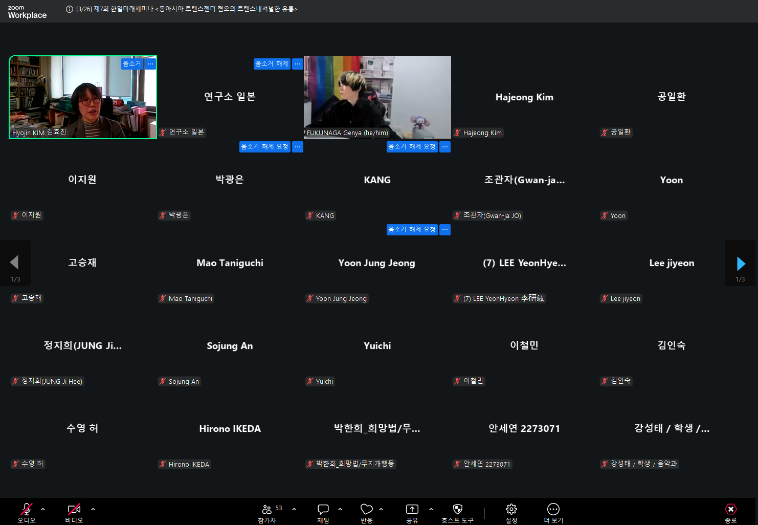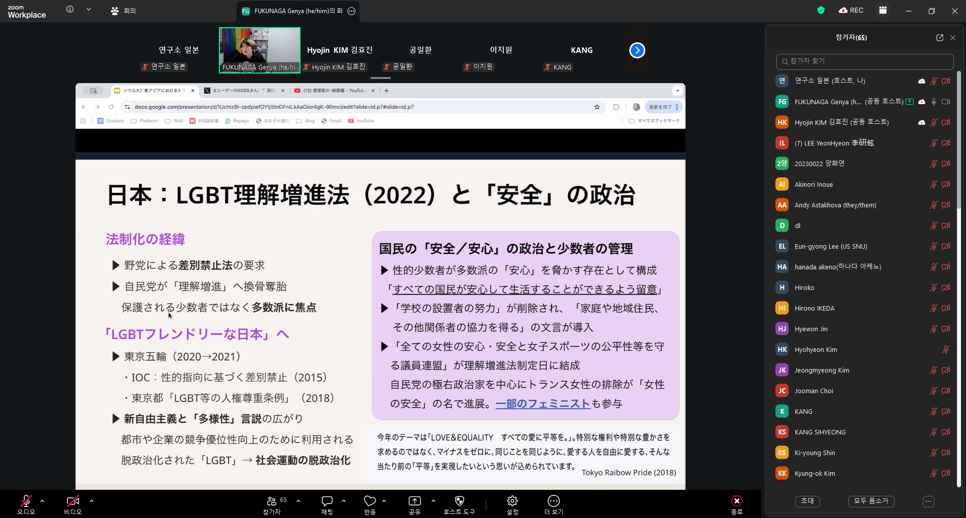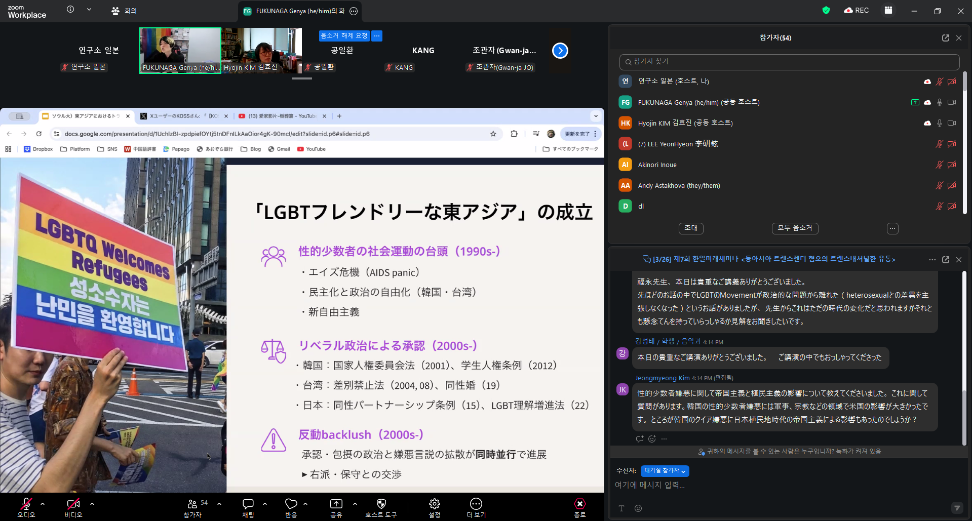 후쿠나가 교수는 1990년대 이후 일본, 한국, 대만의 동아시아 국가들에서 성적소수자에 대한 다양한 형태의 제도화와 승인이 이뤄지는 동시에, 이에 대한 반동으로서 혐오에 대한 확산되어가는 현상에 대해 소개하면서, 특히 한국이 중요한 결절점으로 작용하고 있다고 주장했다. 이러한 혐오가 석권하고 있는 이유에 대해 질문을 던지면서 어떤 행위자 혹은 플랫폼이, 어더한 동기로 어떤 추진력을 통해 이를 확산시키는지에 다뤘다. 강연자는 구조화된 혐오를 단순히 개인의 정동적인 반응으로 바라보는 것이 아니라, 범죄화, 병리화, 규범화라는 세 가지 측면에서 바라봐야 한다고 주장했다. 이러한 관점으로 시대를 구분해 살펴보면 1990년대 부터 한국과 대만의 민주화, 신자유주의의 부상으로 인해 성소수자에 대한 사회운동이 대두된 이래 2000년대 한국, 대만, 일본에서 공통적으로 리버럴한 정치계로부터 이들을 제도적으로 포용하거나 승인하는 변화가 생겨났고, 2000년대 이후 이에 대한 백래시로 혐오 발언이 여러 국가에 걸쳐 동시대적으로 등장하는 것을 관찰할 수 있다고 설명했다. 특히 이러한 국경을 넘어선 혐오의 확산을 확인할 수 있는 사례로 한국 기독교 계열 단체가 제작한 대만의 반동성애 프로파간다 동영상의 사례를 소개했다. 마지막으로 동아시아를 넘나드는 혐오 확산의 경로 중 하나로 종교우파의 네트워크, 보수적인 언론계를 통한 혐오언설의 번역과 유통의 가능성을 제안하며 발표가 마무리되었다.