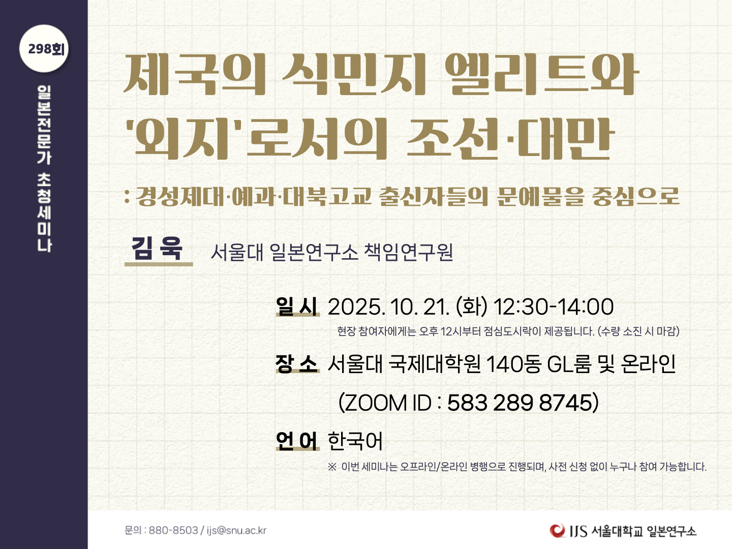 2025년 10월 21일, 제298회 일본전문가 초청 세미나가 서울대 국제대학원 GL룸과 온라인 zoom에서 개최되었다. 하이브리드 강연으로 진행된 이번 행사에서는 김욱 서울대학교 특임연구원이 “제국의 식민지 엘리트와 ‘외지’로서의 조선·대만: 경성제대 예과·대북고교 출신자들의 문예물을 중심으로”를 주제로 발표했다.