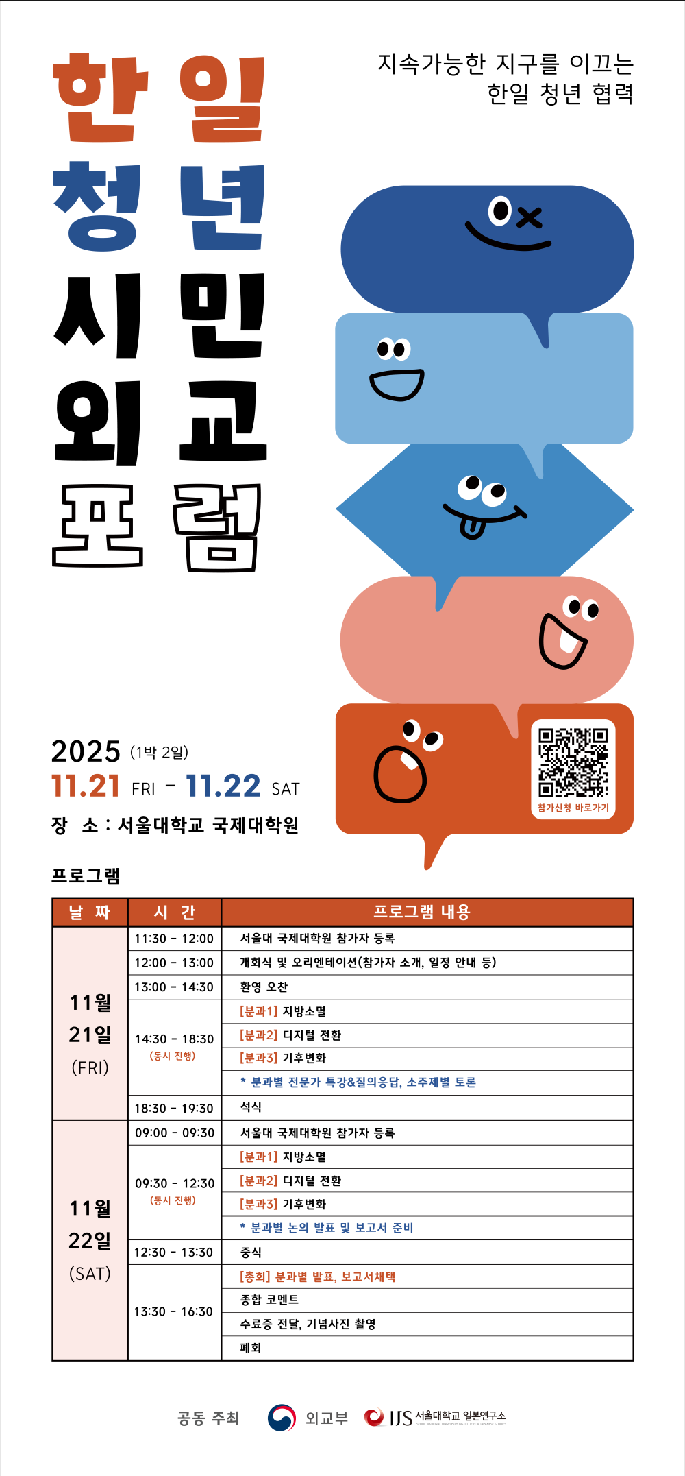 The Institute for Japanese Studies (IJS) at Seoul National University, together with the Ministry of Foreign Affairs, is hosting the Korea-Japan Citizen Diplomacy Youth Forum from Friday, November 21 to Saturday, November 22, 2025, in Seoul.