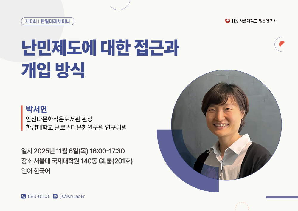 The Korea–Japan Future Seminar series is organized by the Institute for Japanese Studies at Seoul National University (SNU-IJS) with support from the Hakbong Scholarship Foundation. The seminar invites experts, researchers, and practitioners from both countries across diverse fields to explore common challenges facing Korea and Japan through multidimensional analysis and dialogue. Through this initiative, SNU-IJS seeks to build a network of professionals dedicated to fostering cooperation, coexistence, and shared prosperity between the two nations.